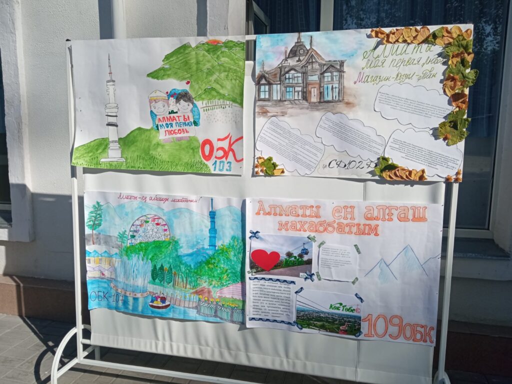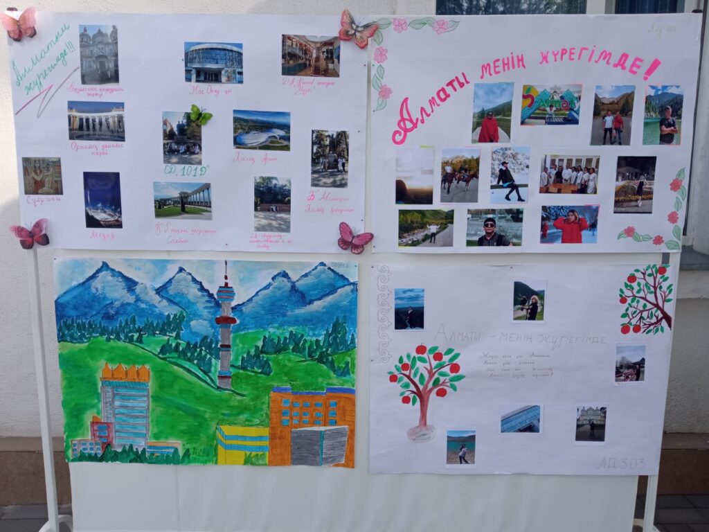 День города Алматы. Обучающиеся колледжа Аяжан организовали мини выставку плакатов, рисунков “Алматым жүрегімде”.