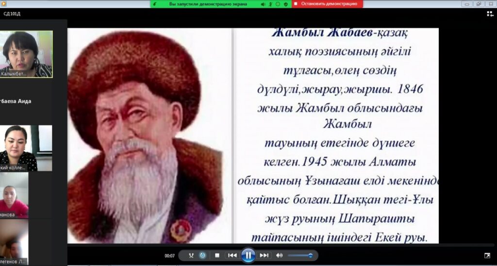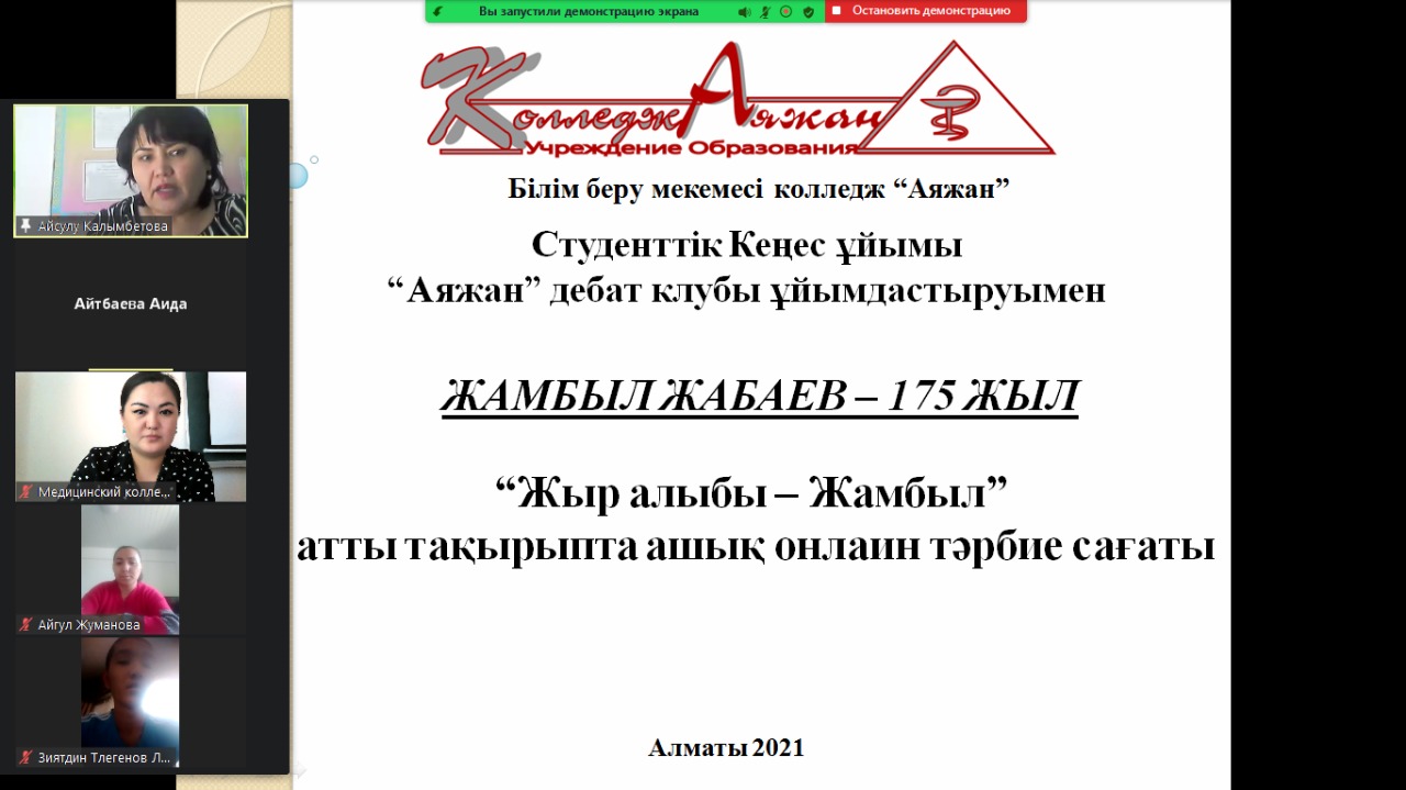 Білім беру мекемесі «Аяжан» колледжі білім алушыларымен қазақ халық поэзиясының әйгілі тұлғасы, өлең сөздің дүлдүлі, жырау, жыршы -Жамбыл Жабаевтың 175 жылдығына орай ашық тәрбие сағаты онлайн ZOOM арқылы өтті. Тәрбие сағаты барысында білімалушылар ақын-Ж.Жабаевтың шығапмаларынан үзінді оқып, өздері дайындаған видеоролик, слайдтар көрсетілді.