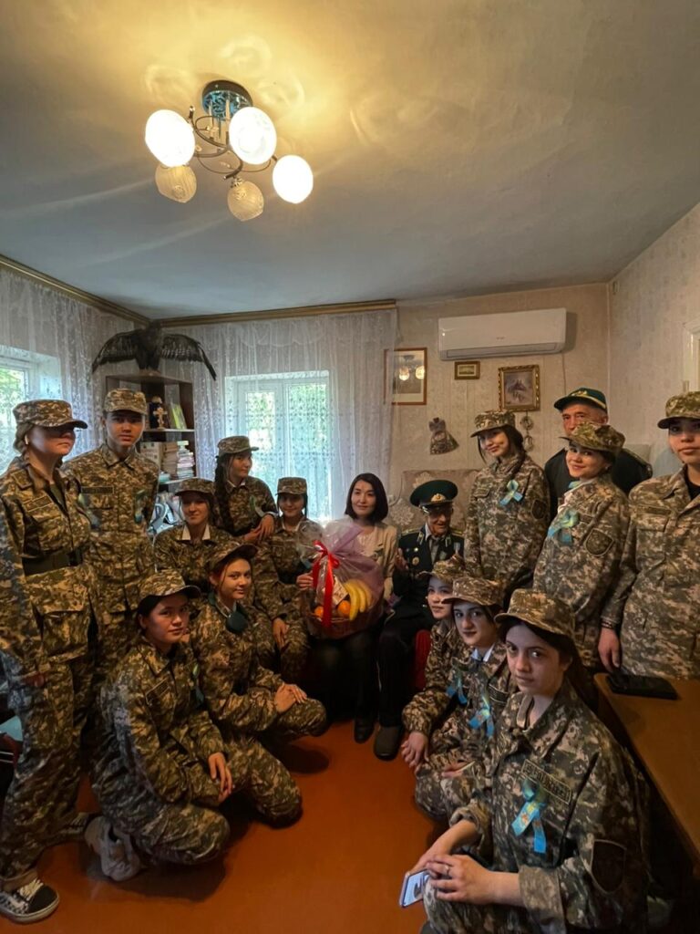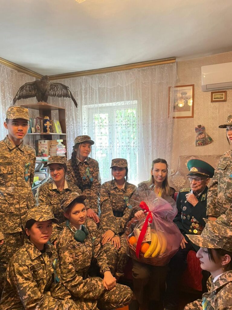 Солдата Победы поздравили обучащиеся колледжа. Таратунин Николай Александрович – пограничник, кавалер двух орденов “Красной Звёзды”, ордена “Отечественной войны 1 степени”, ордена “Құрмет”, полковник в отставке в апреле отправдновал свой 100-летий юбилей.