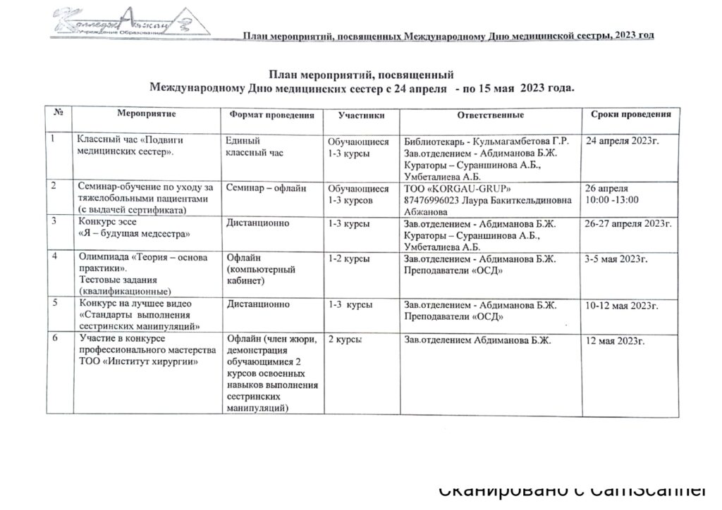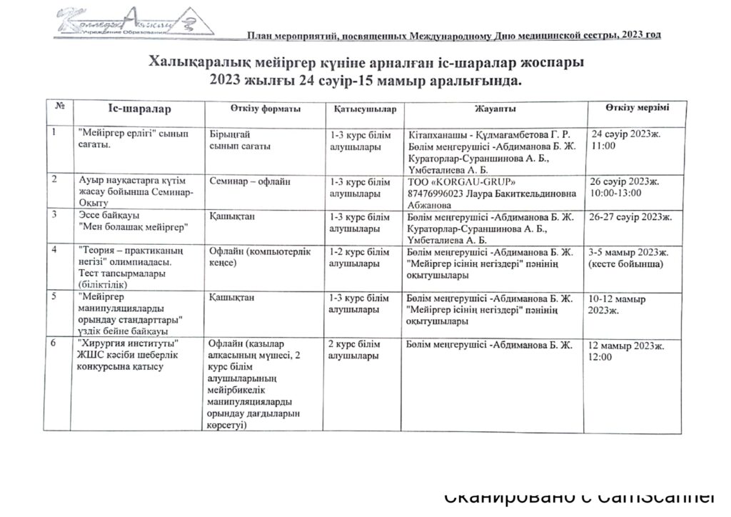 • План работы медицинского кабинета по УО колледж «Аяжан»