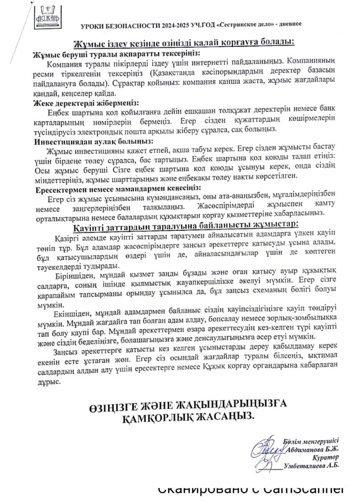 • План работы медицинского кабинета по УО колледж «Аяжан»