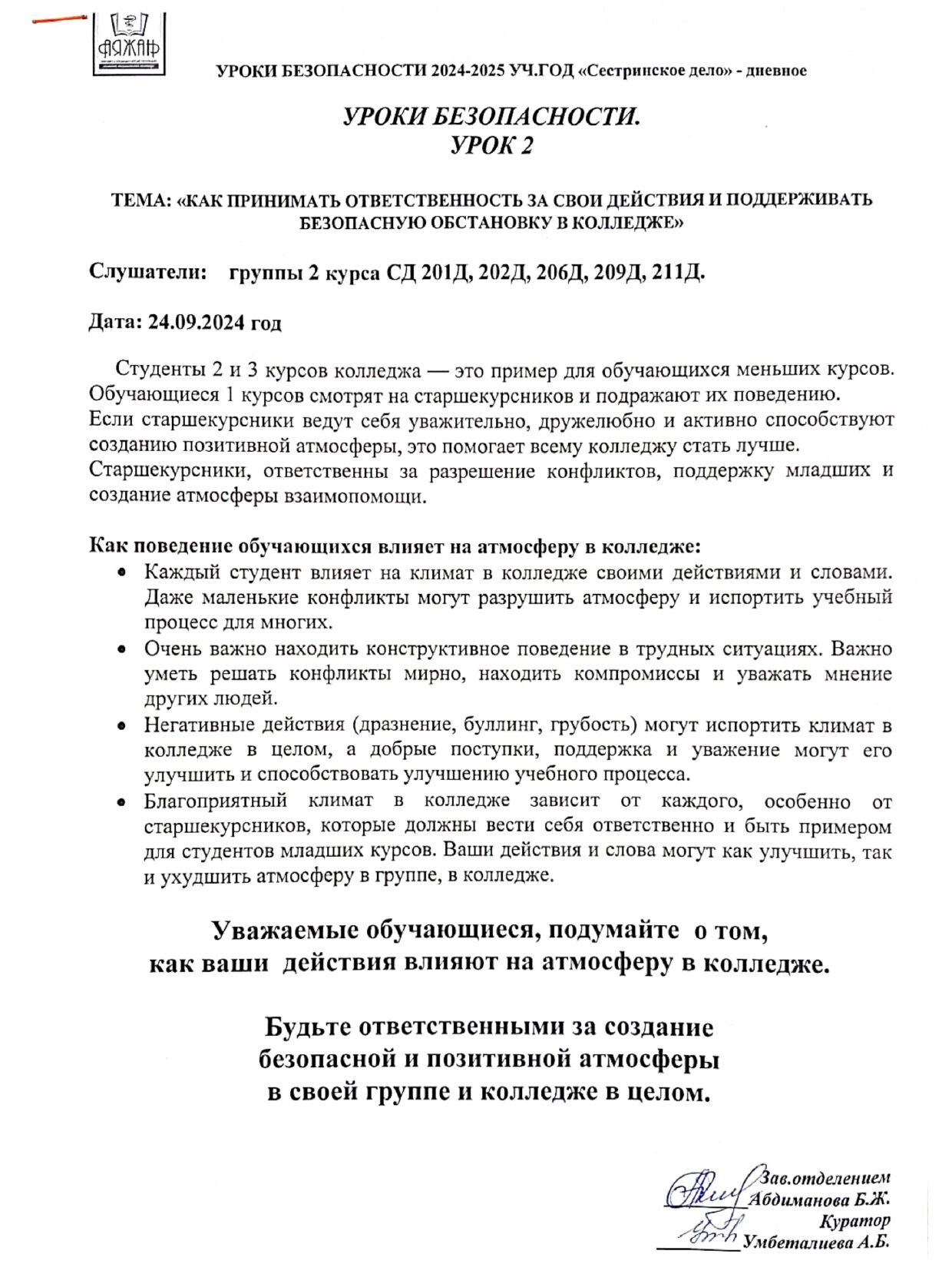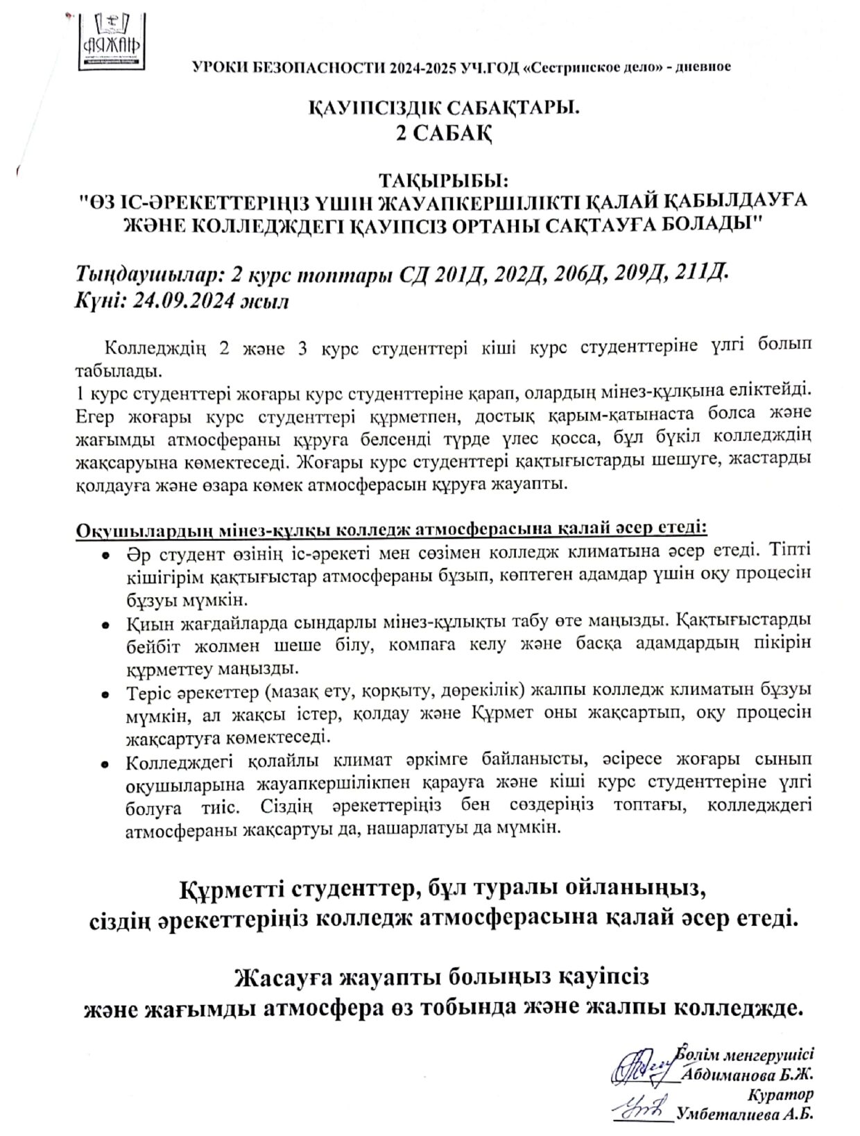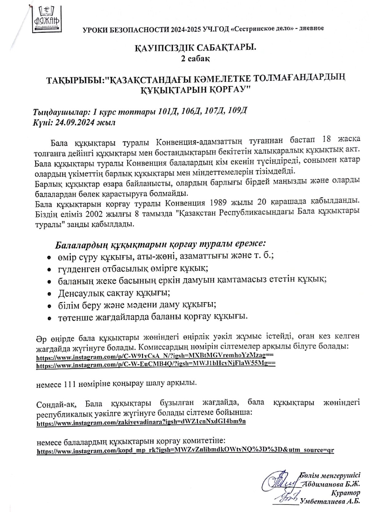 План работы медицинского кабинета по УО колледж «Аяжан»