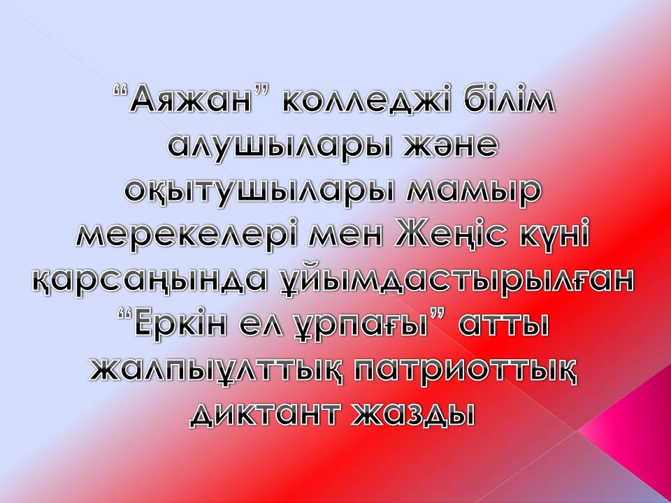 “Аяжан” колледжі білім алушылары және оқытушылары мамыр мерекелері мен Жеңіс күні қарсаңында ұйымдастырылған “Еркін ел ұрпағы” атты жалпыұлттық патриоттық диктант жазды