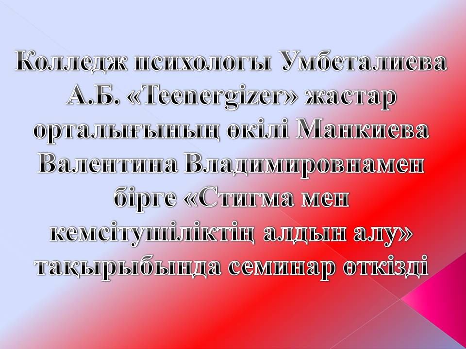 Бүгін, колледж психологы Умбеталиева А.Б. «Teenergizer» жастар орталығының өкілі Манкиева Валентина Владимировнамен бірге «Стигма мен к...