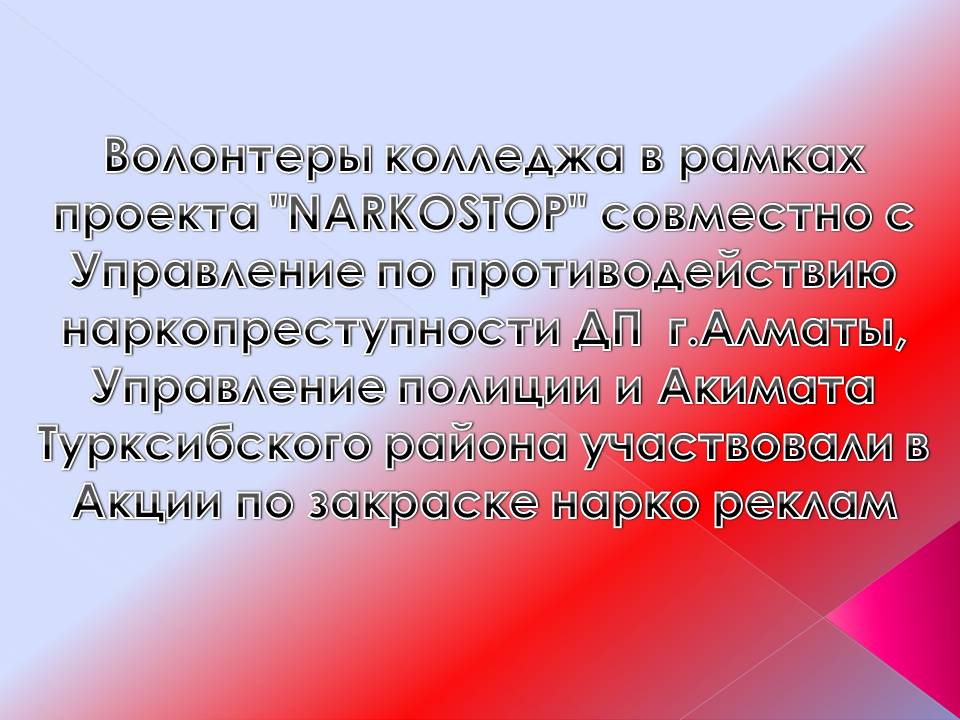 16 Фев НОВОСТИ Волонтеры колледжа в рамках проекта “NARKOSTOP” совместно с Управление по противодействию наркопреступности ДП г.Алматы, Управление полиции и Акимата Турксибского района участвовали в Акции по закраске нарко реклам 16 февраля, 2023 By admin Сегодня, волонтеры колледжа в рамках проекта "NARKOSTOP" совместно с Управление по противодействию наркопреступности ДП г.Алматы, Упра...Подробнее