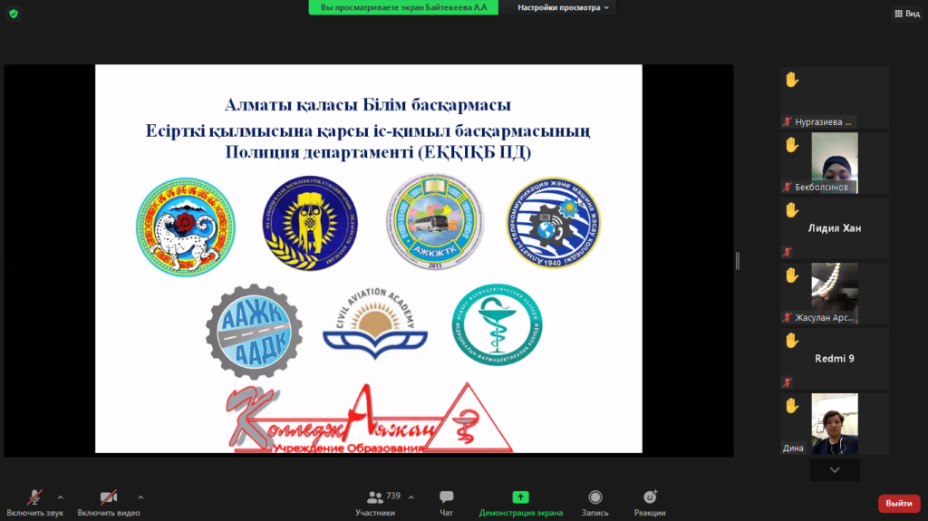 ZOOM платформасы арқылы 2021 жылдың 21 сәуір күні Білім беру мекемесі «Аяжан» колледжі студенттеріне нашақорлықтың алдын алу мақсатында...