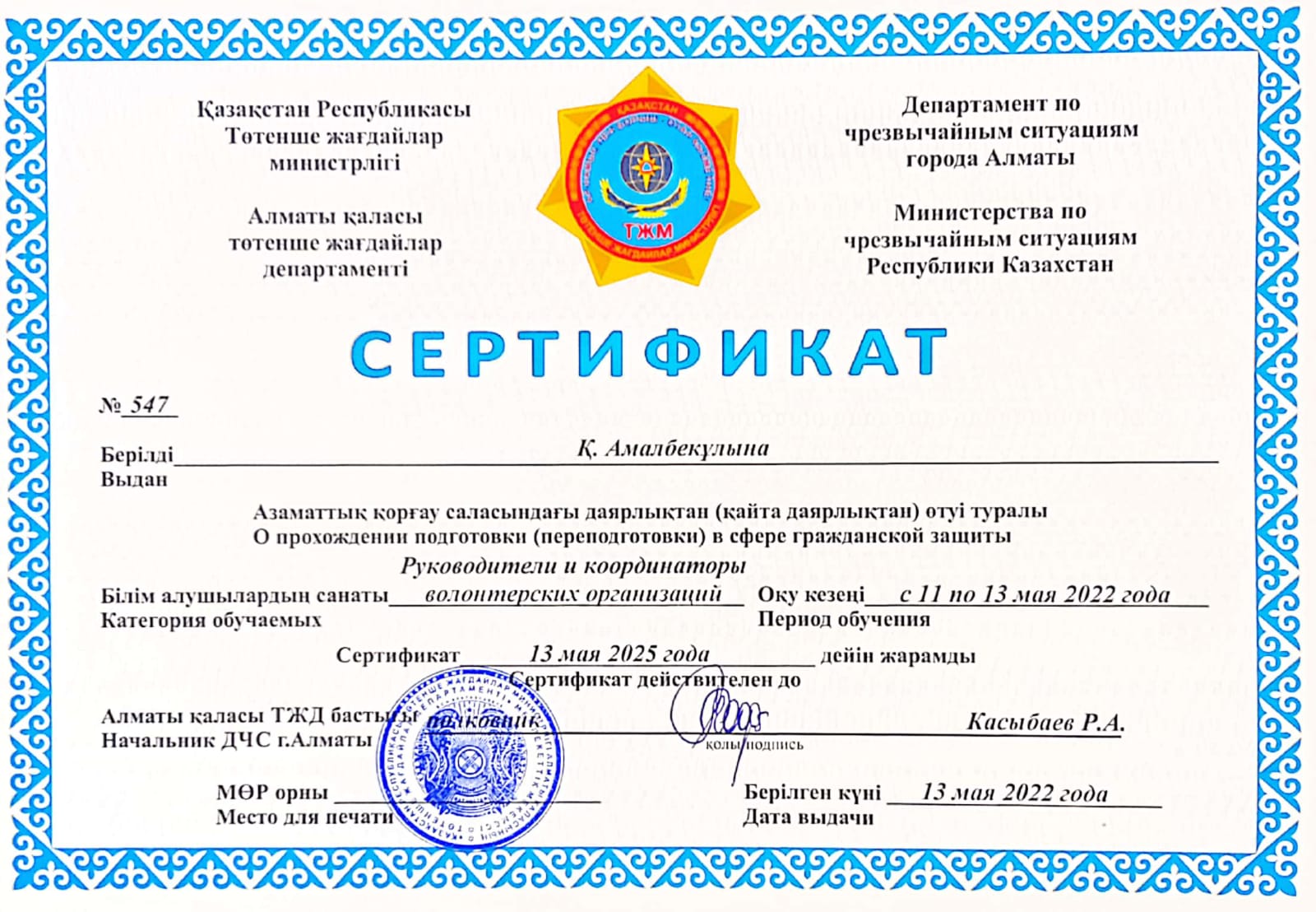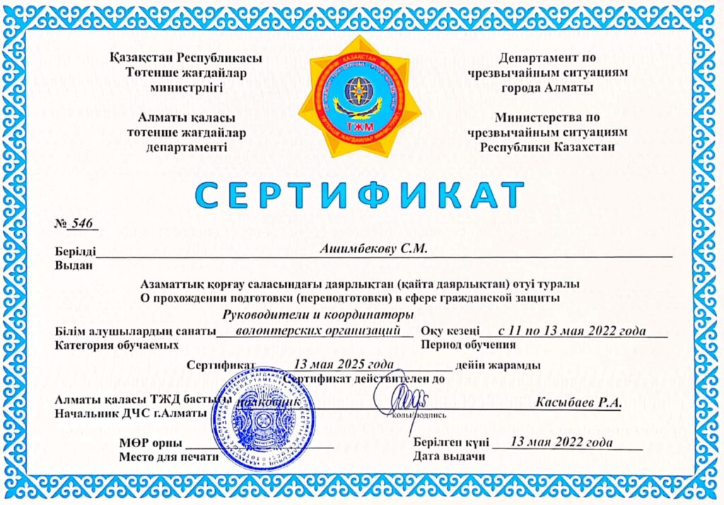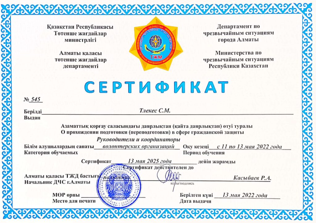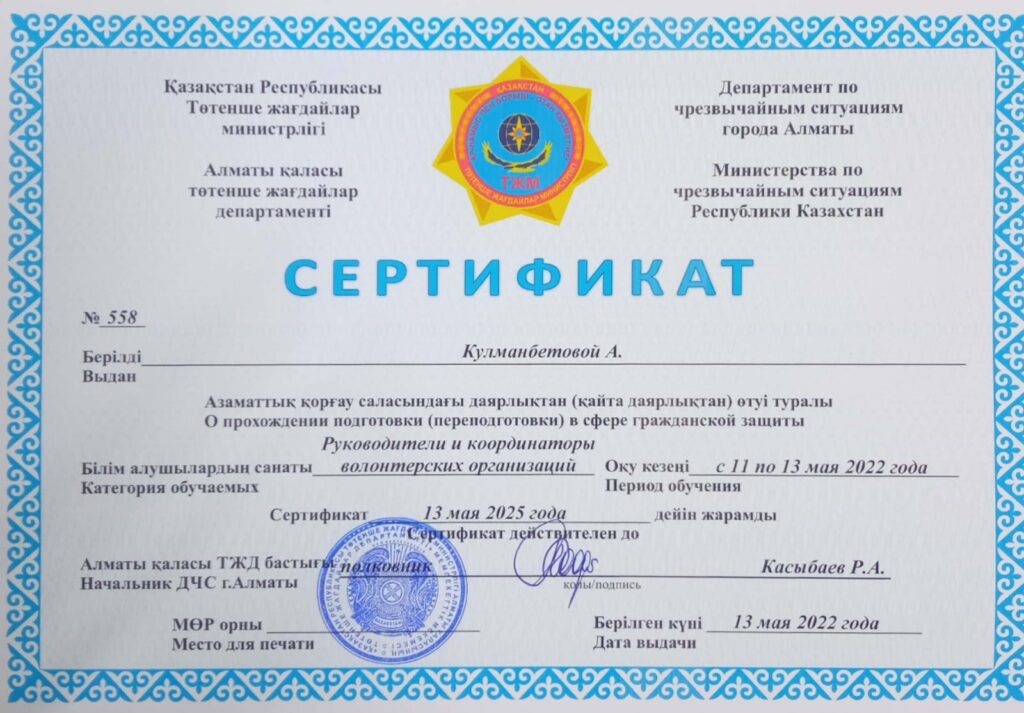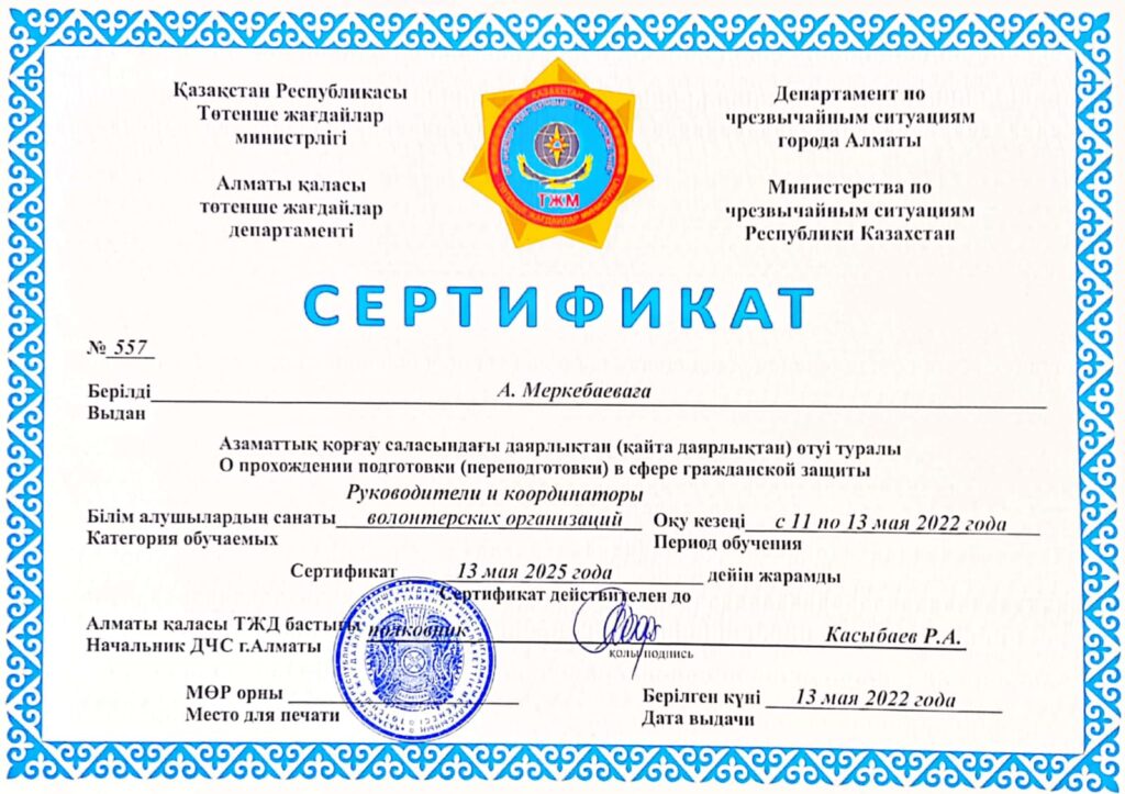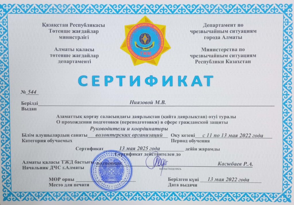 НОВОСТИ По итогам обучения волонтеров в сфере гражданской защиты на базе Департамента ЧС г.Алматы 8 обучающихся специальности Сестринское дело получили сертификаты. 30 мая, 2022 Опубликовано admin 30 Май