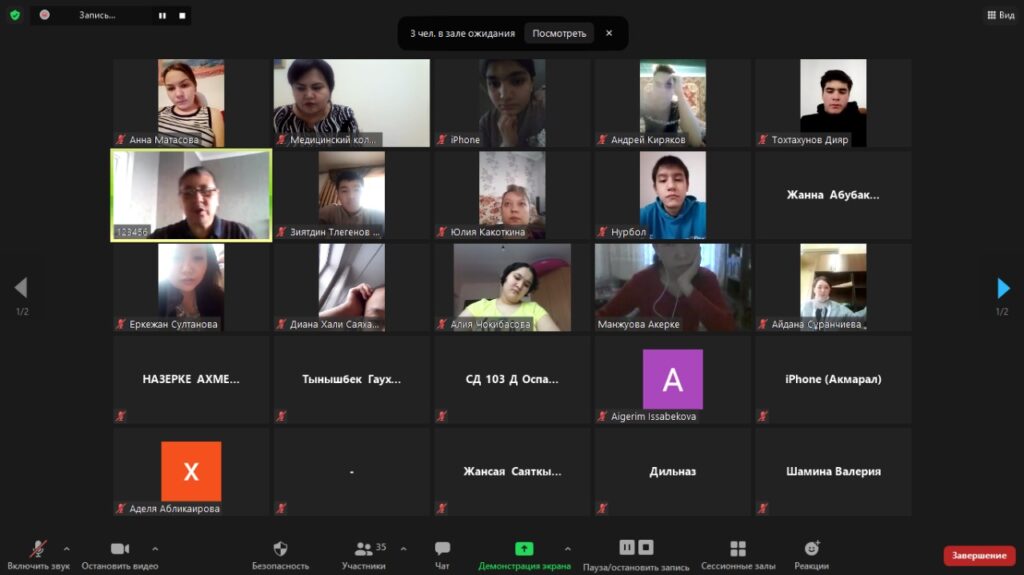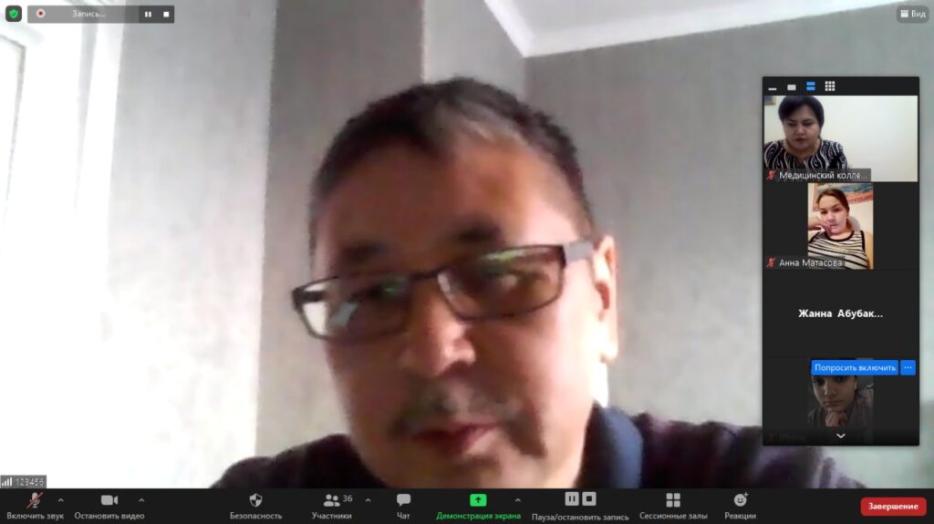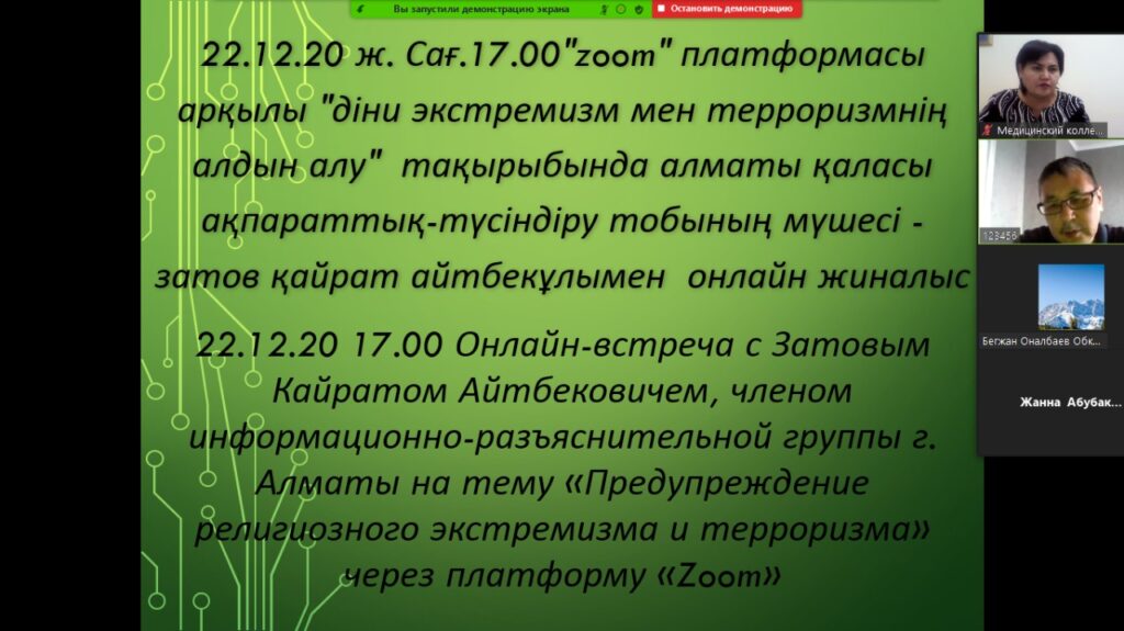 На площадке «ZOOM» прошла онлайн-встреча на тему «Предупреждение религиозного экстремизма и терроризма» с членом информационно-разъяснительной группы г. Алматы – Затовым Кайратом Айтбековичем. У студентов колледжа есть вопросы, которые им нужны поставил и получил ответ.