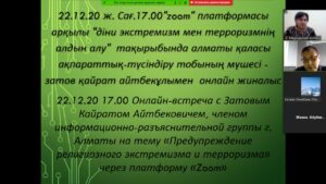 “zoom” платформасы арқылы “Діни экстремизм мен терроризмнің алдын алу” тақырыбында Затов Қайрат Айтбекұлымен онлайн жиналыс болды.